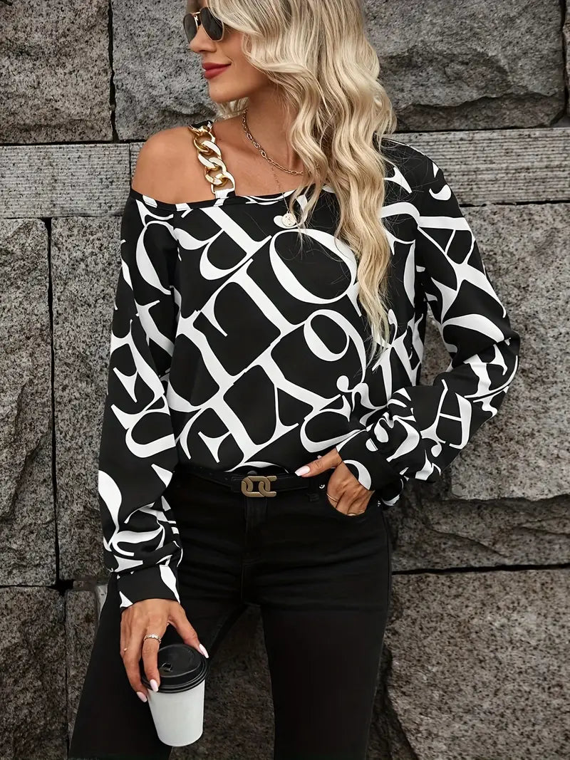 Casual Slanted Shoulder Letter Print Chain Long Sleeve Blouse