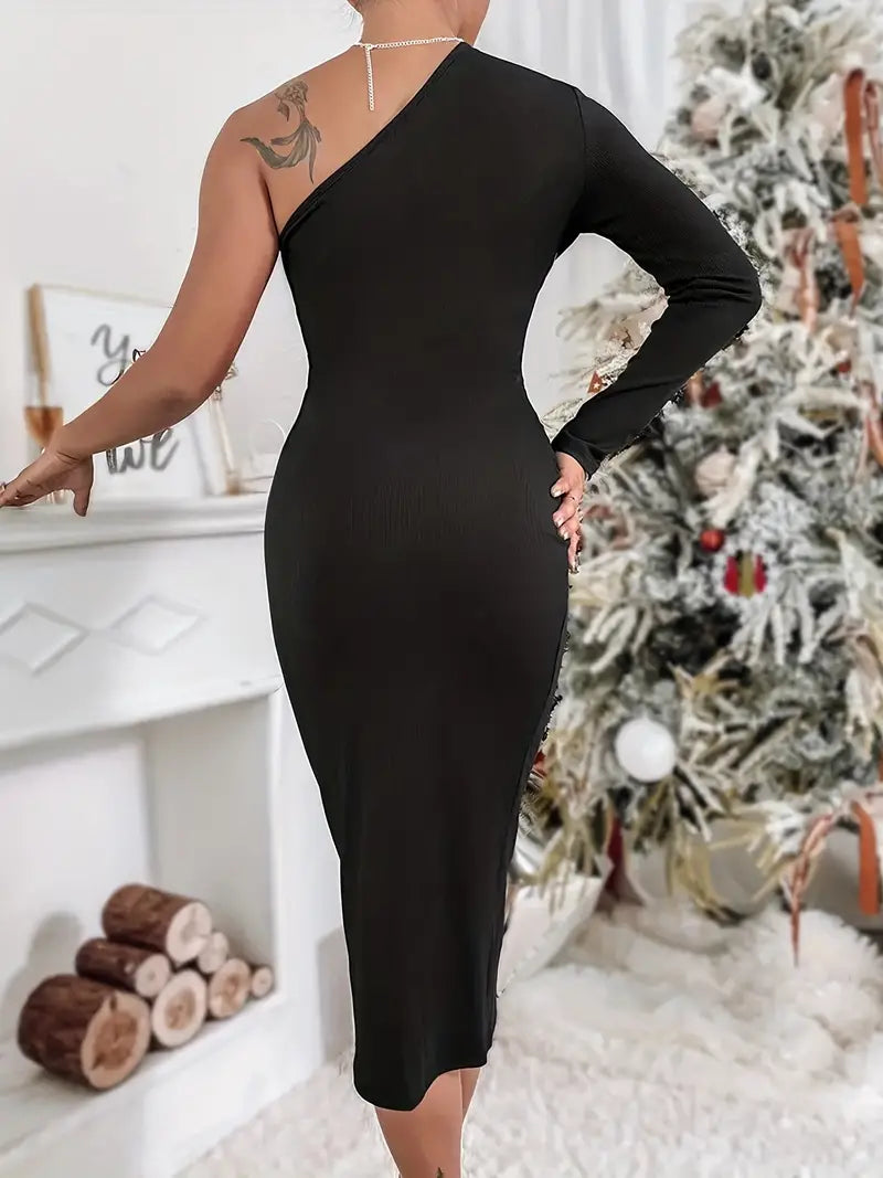 Captivate in Vintage Elegance with our One Shoulder Zipper Bodycon Dress