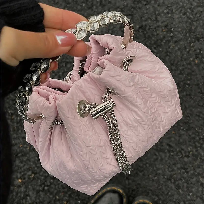 Glamorize your look with this timelessly sophisticated mini handbag! Adorned with statement-making rhinestone leaf handle and crafted with quilted pattern, it is perfect for any elegant occasion. Featuring a drawstring closure and a fixed shoulder strap for easy transport and a wristlet for added security, this versatile solid-colored bag will be an exquisite addition to your style.